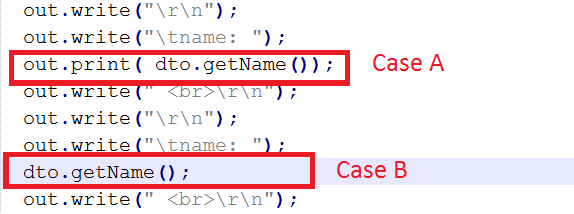 <%= %>,这是表达式标签。无论您在其中编写什么,都将被视为out.print();的参数,尽管在使用表达式标记时不需要使用;,比如case A。