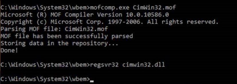 C:\Windows\System32\wbem>mofcomp.exe CimWin32.mofC:\Windows\System32\wbem>regsvr32 cimwin32.dll重新注册相关的DLL。