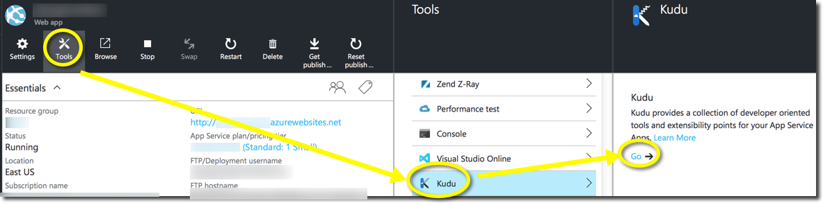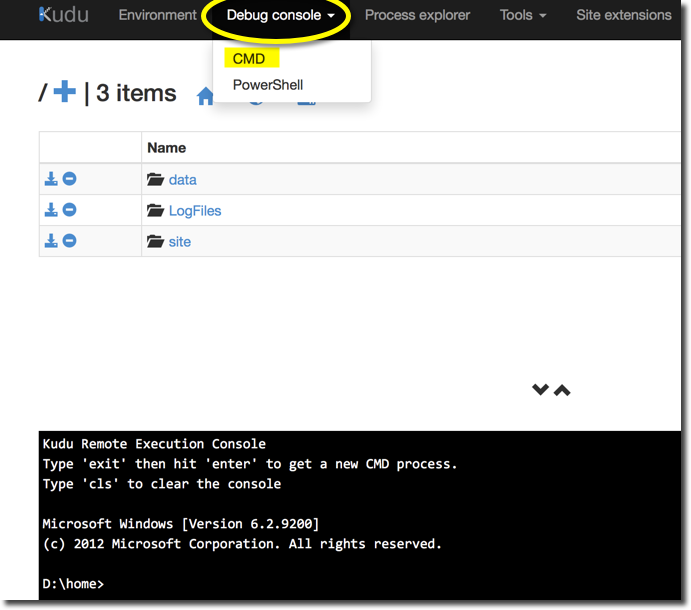 虽然不能将RDP放到Web实例中,但您可以通过kudu连接到它们,并通过访问yoursite.scm.azurewebsites.net获得命令提示符。您还可以通过门户实现这一点: