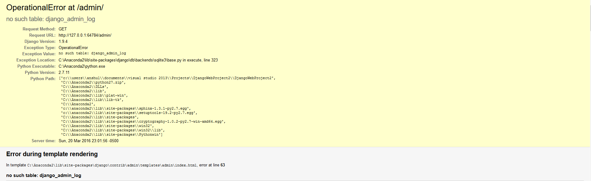 因此,我运行我的程序的基础上从这里,它的工作没有任何错误。我去了/admin。我登入。到目前为止一切都很好。当它加载时,我得到了这个: