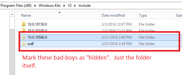 UPDATE:安装了WDK10和SDK10后,10.0.10586.0文件夹已正确填充,无需将其标记为隐藏的。虽然我不知道哪个工具包部署了该文件夹,但我怀疑之前缺少头的原因是安装了更早的版本。