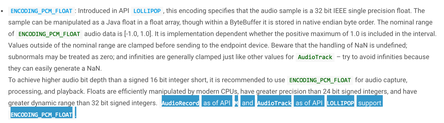 但是AudioRecord只支持AudioFormat.ENCODING_PCM_FLOAT,因为Marshmallow。