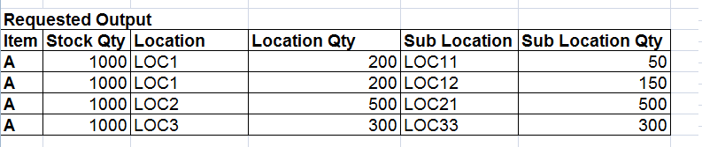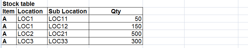 子位置Qty表示项目A的总数量,每个子位置的特定位置。