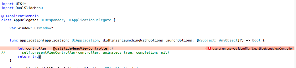 您需要在pod的代码中将DualSlideMenuViewController标记为public。