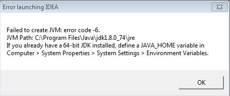 我在64位模式下启动Intellij (15.0.3)有问题。当单击idea6.exe时,我会得到这个错误(未能创建JVM错误代码-6):