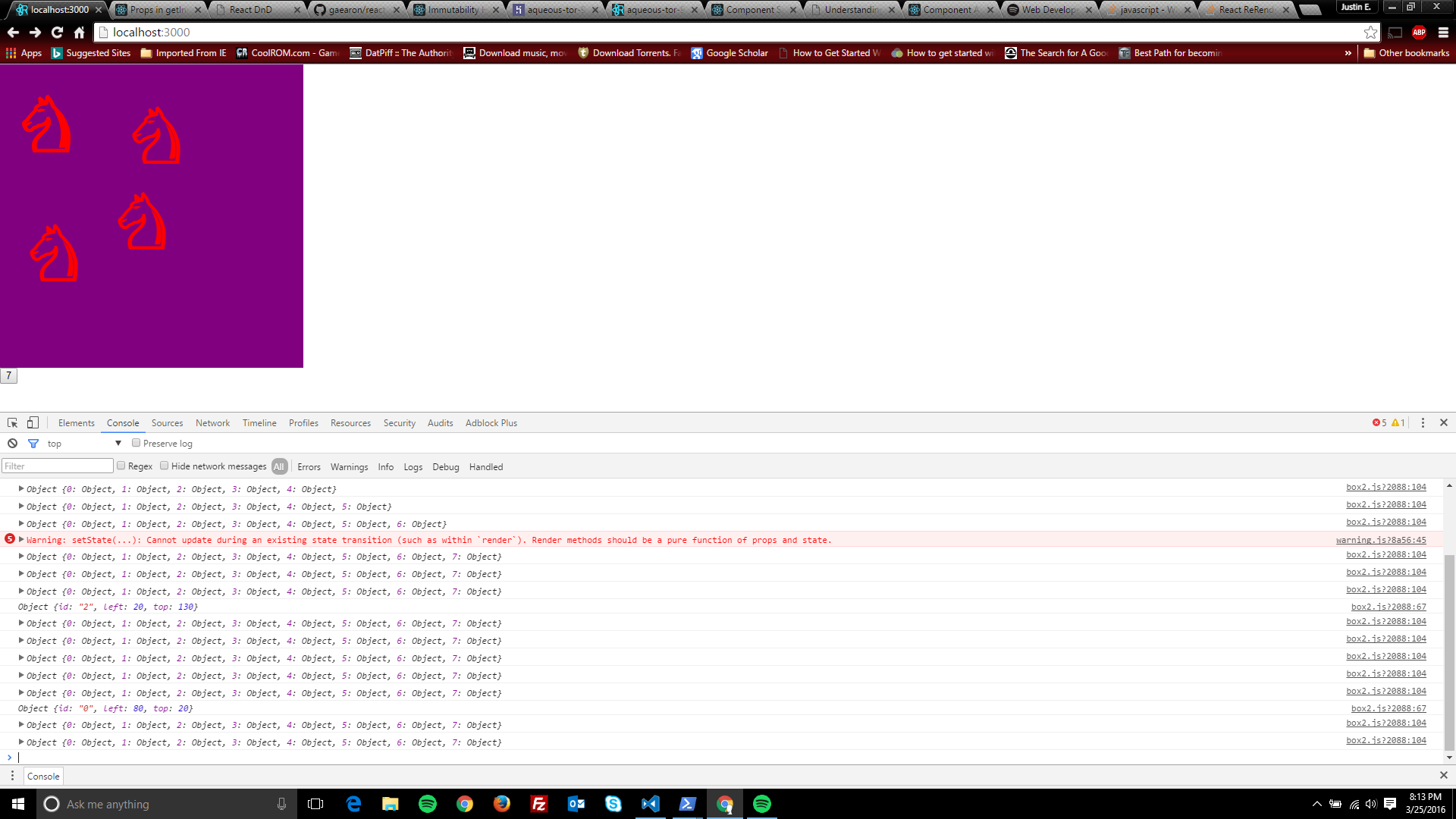 我正在创建一个web应用程序,它允许用户在屏幕上拖动和拖动多个片段,每个片段都包含特定的数据。如果用户希望将更多的片段添加到屏幕上,他们只需单击一个按钮,另一个片段就会出现。我使用React (拖放和悬垂)库来保持组件的解耦,到目前为止,这还不错。问题是在屏幕上添加更多的片段的动态特性。目前(在下面的子代码中),我正在获取旧的state对象,执行一个浅拷贝,并将新创建的对象与预先存在的状态对象合并,并在完成后更新状态。但是,每次执行此操作时,所有操作都很正常(在屏幕上生成的新片段),直到我移动一个新的部分,并得到以下错误: