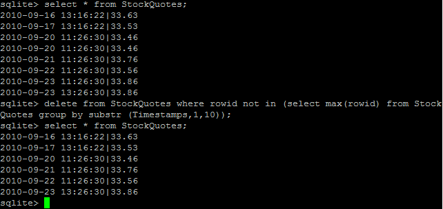 delete from StockQuotes where rowid not in (select max(rowid) from StockQuotes group by substr (Timestamps,1,10));