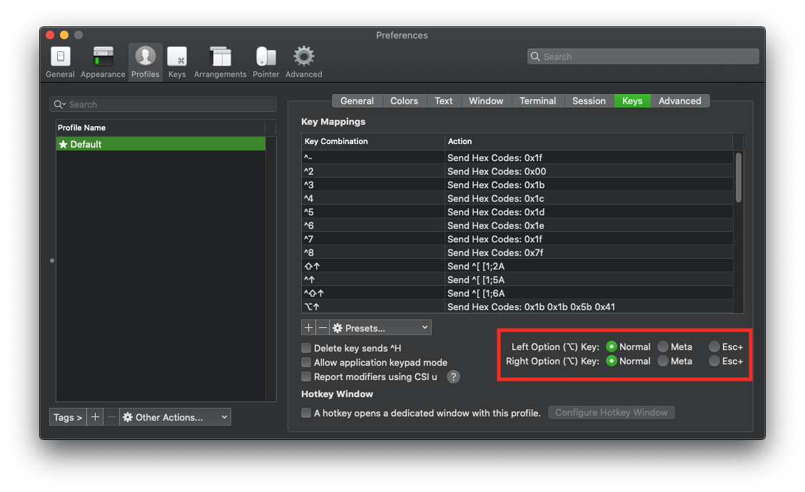您可以通过选择“->配置文件->键”并从“Esc+”更改为“Normal”来更改此操作。