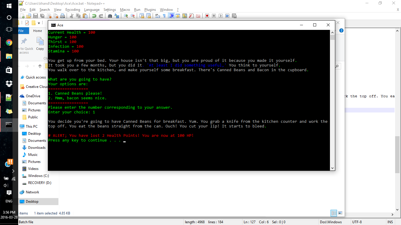 call :colorEcho 7 "You decide you're going to have Canned Beans for breakfast. Yum. You grab a knife from the kitchen counter and work the top off. You eat the beans straight from the can. Ouch! You cut your lip! It starts to bleed."
