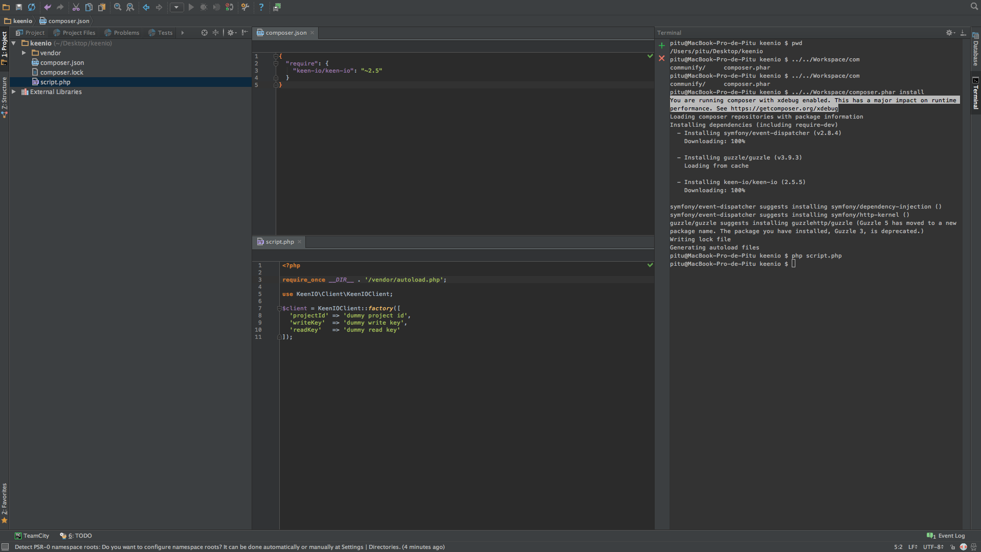 }然后输入这个命令$ composer update来更新composer.json并生成./vendor/autoload.php。这个JSON的目的是连接到keen.io以使用PHP。