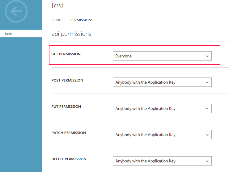 为了方便测试,我更改了api的权限如下,然后我可以使用浏览器访问api链接https://<mobile-service-name>.azure-mobile.net/api/test。