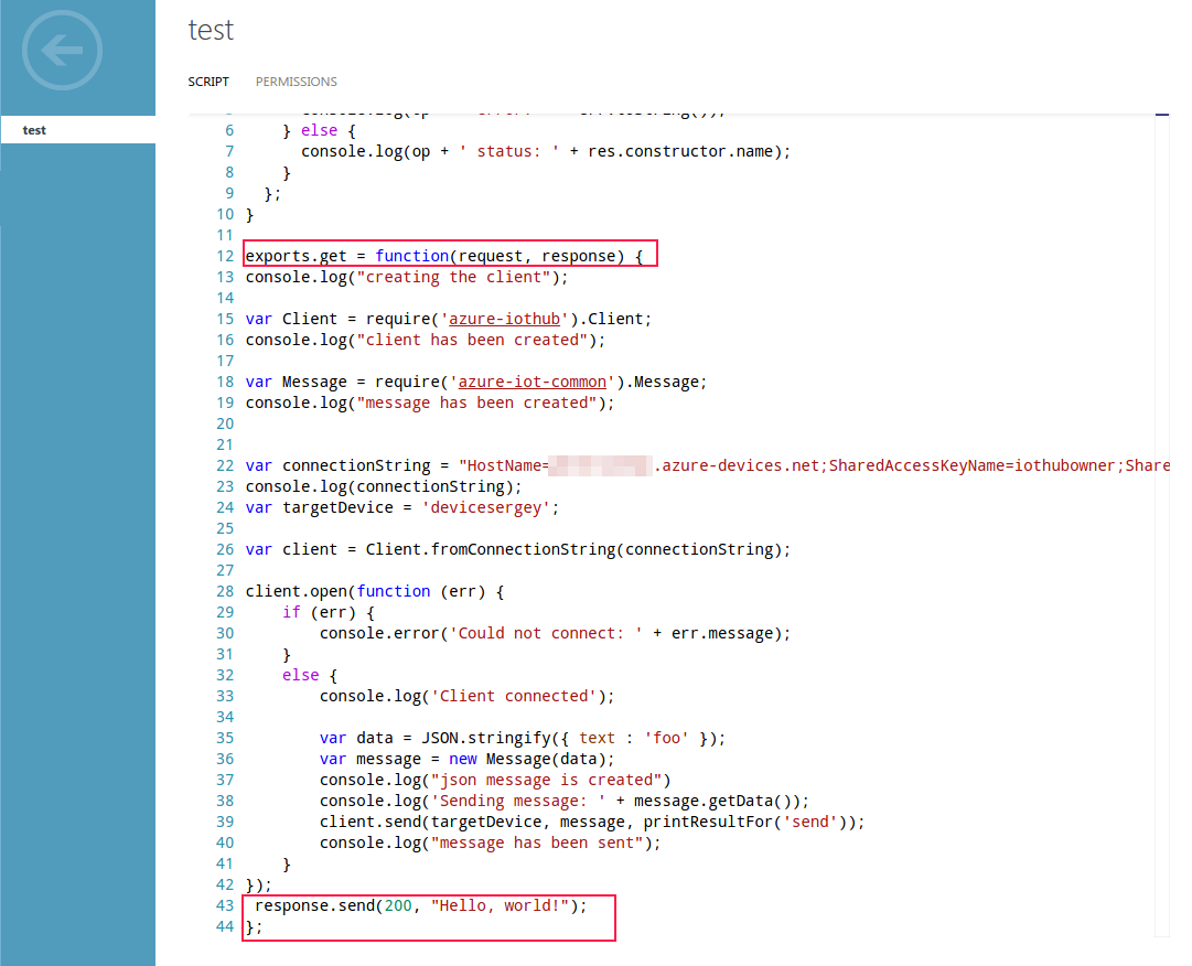 我刚刚尝试在新的Azure MS上执行我的脚本,结果失败了。我会一步一步地写我的动作,也许你会发现任何错误,因为我不太擅长NodeJS。
