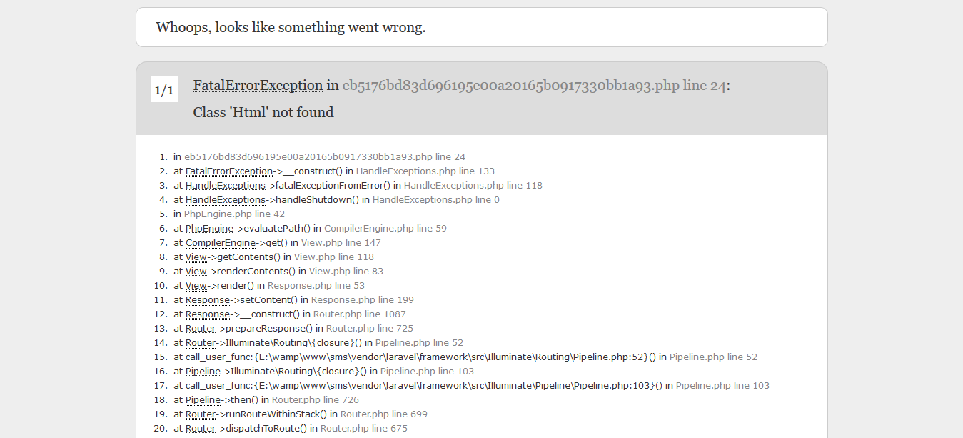 'Html' => Collective\Html\HtmlFacade::class在这里找到了解决方案,