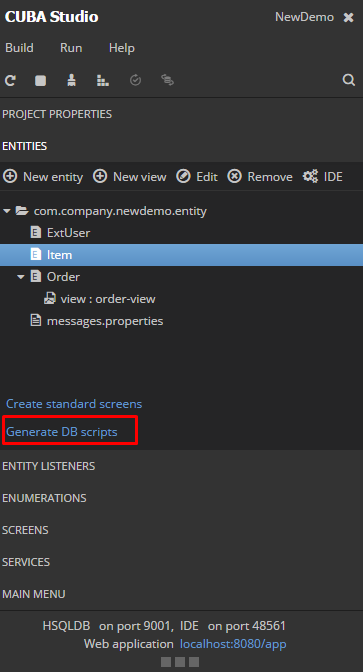 另一种方法是修改更新脚本。如果使用CUBA Studio,则转到实体面板并按Generate脚本,如下图所示: