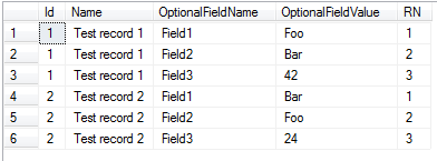 from (select Id, Name, OptionalFieldName, OptionalFieldValue, row_number() over (partition by Id order by Id) RN from #tmp) src