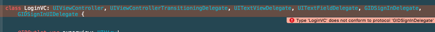 它是说您的类还没有为您的GIDSignInDelegate实现必需的方法。Swift 3中的方法名称有很大的变化。因此,您的新方法将是