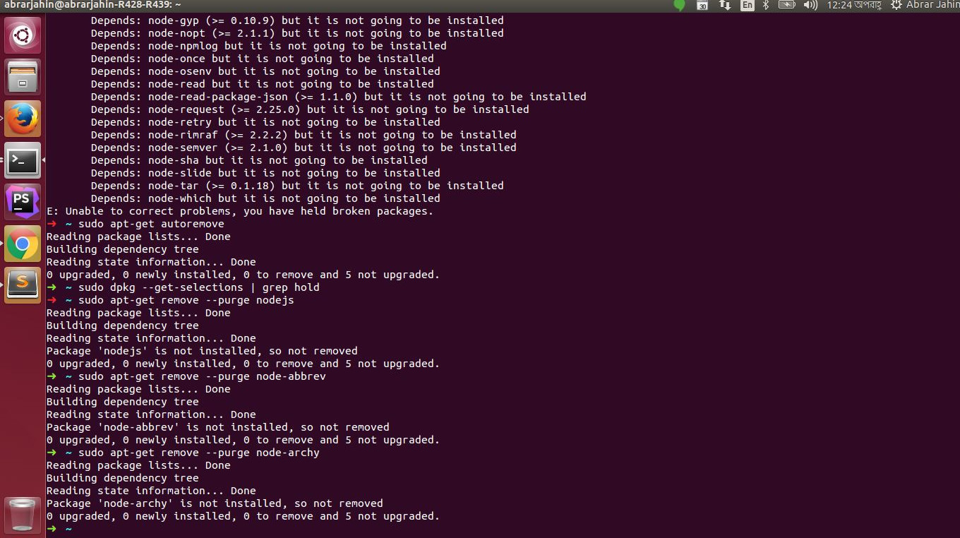 sudo dpkg --get-selections | grep holdsudo apt-get remove --purge <package>)上述命令列表中的所有包。现在以正确的方式安装Node: