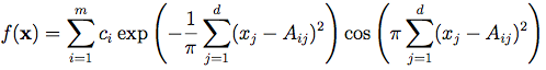 该函数通常在(x, y) ∈ [0, 10] x [0, 10]上进行评估。它提出了m极小值,其重要性由c决定。它们被余弦的乘积调制,这给了它们一个振荡的特征。