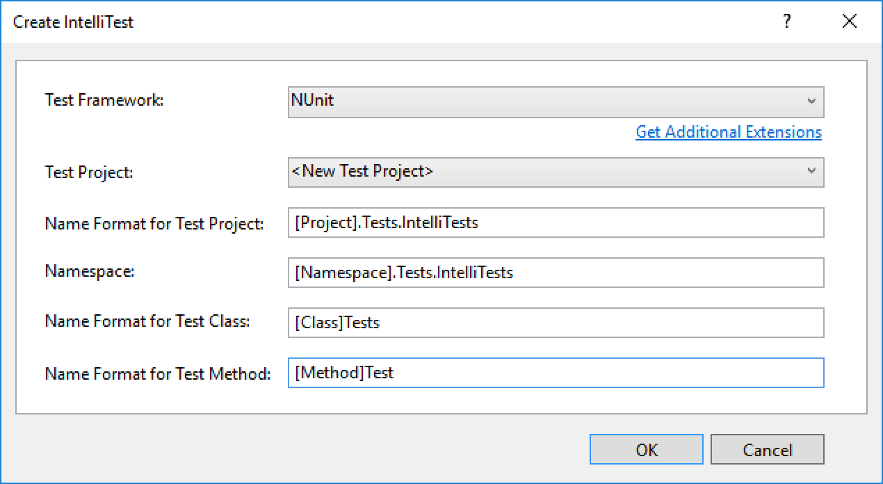 在我的项目中,有一个类有一个方法。我首先正确地单击了方法,并从上下文菜单中选择了Create IntelliTest。然后,我使用以下设置创建了一个测试项目: