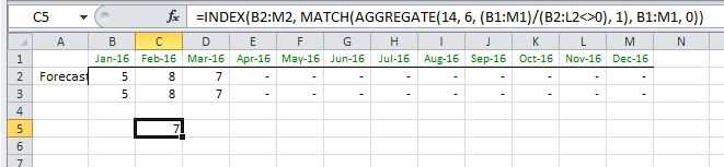 =INDEX(B2:M2, MATCH(AGGREGATE(14, 6, (B1:M1)/(B2:M2<>0), 1), B1:M1, 0))