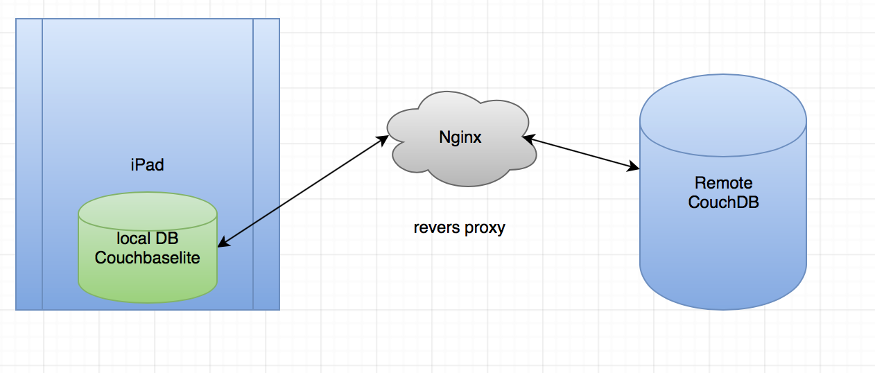 我的场景:当没有internet连接时,所有数据都是本地存储的,当internet返回时,数据与远程CouchDB数据库同步--参见附加的体系结构图(这里使用Nginx作为revers代理)。