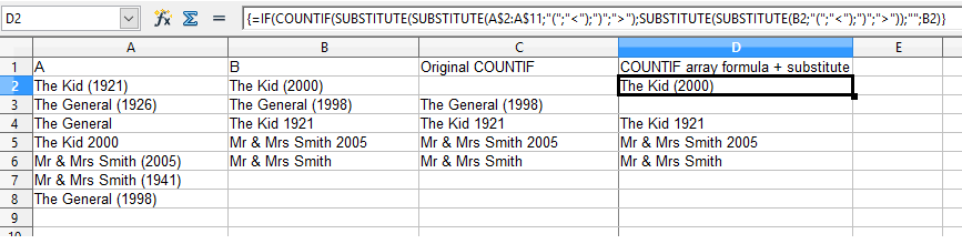 **=IF(COUNTIF(A$1:A$8000;B1);"";B1)**不幸的是,带括号的字符串似乎在Libre/Open Office中提供了虚假的匹配。我想你可以通过换人来解决这个问题
