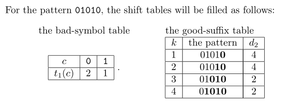 好的后缀规则是寻找一个已经匹配的后缀的实例,其中前面的字符不同。例如,在第一个表中的“好后缀”00的情况下,shift寻找一个没有0前面的00实例。