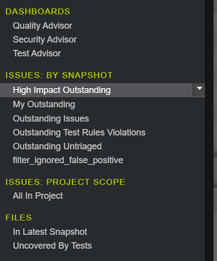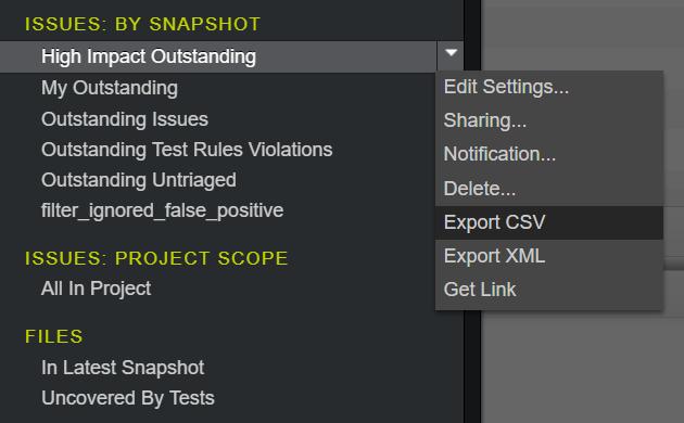 对于那些希望使用web接口将CSV导出到Coverity服务器的人,如果您打开菜单侧边栏,那么在“looking by .”中和“文件”部分,每个小节都有一个下拉选项"Export“来完成工作!