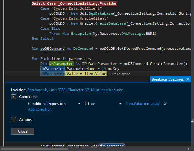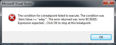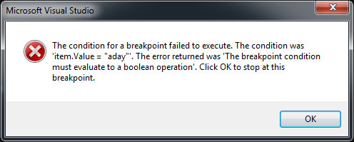 上面的代码在其底线设置了一个条件断点(黄色),后面是断点设置对话框,应该与: item.Value == "aday“一起使用。