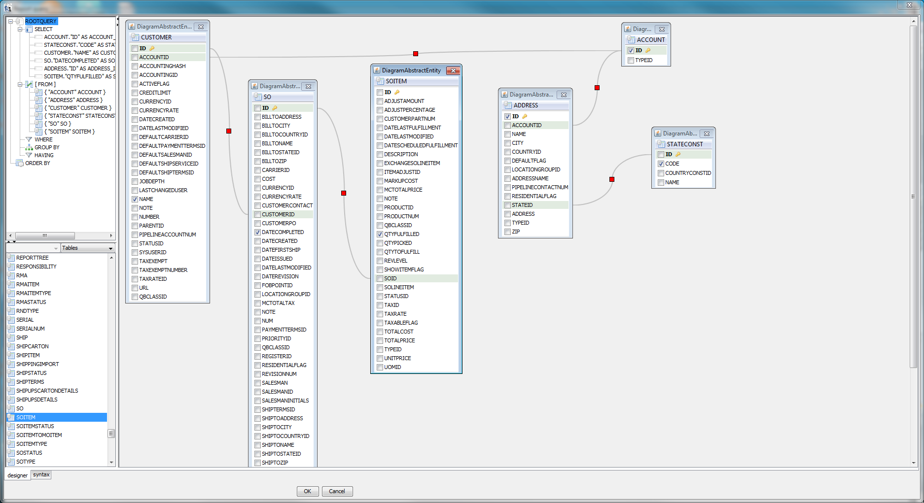 INNER JOIN "SOITEM" SOITEM ON SO."ID" = SOITEM."SOID"错误是: