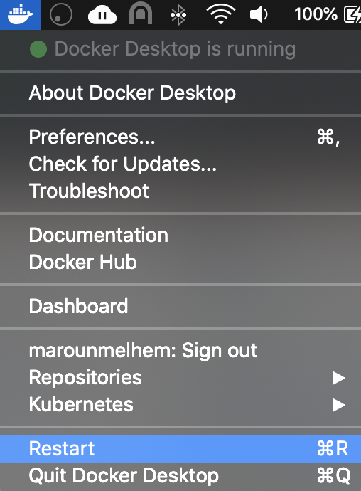 对于Mac用户,状态栏图标中的restarting docker修复了以下问题: