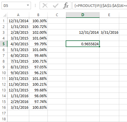 我有时间序列返回,我想得到基于日期范围的产品。=product(if($B:$B,A:A,">="&$A$2,A:A,"<="&A13))不能工作,因为这个函数有太多的参数。以下是一个例子,