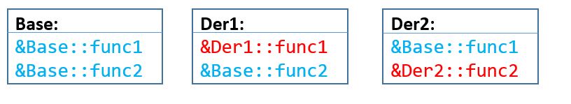 我希望下面的例子会有所帮助。派生类只复制基类的虚拟表,但它们可能修改适当的条目。红色部分显示给定类修改了v表中的条目。因此,在创建派生类的实例时,将考虑修改后的表(特定于该类)。
