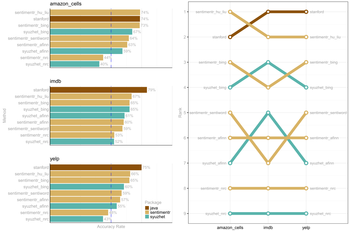 toc() # Time difference of 6.724482 mins要了解更多关于时间和准确性的信息,请访问我的感伤型README.md,如果它是有用的,请星号回购。下面的内容捕获了自述文件中的一个测试: