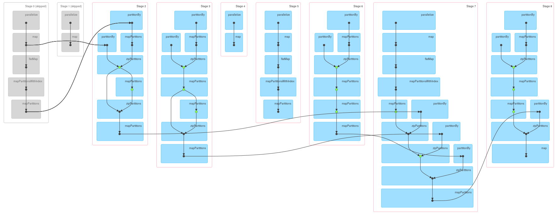 val minGraph = graph.connectedComponents()在星星之火用户界面中,我可以看到每一个下一个工作都会有越来越多的跳过的阶段。