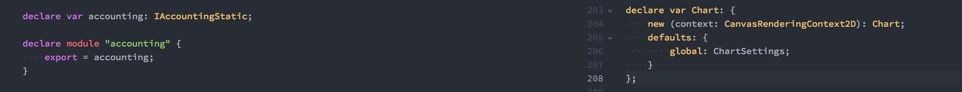 }重要:注意到chart.js定义文件没有正确的模块声明。左边是会计JS库,它清楚地定义了模块并工作。我猜这就是问题所在。如何使用声明的变量或将其导入另一个JS文件?