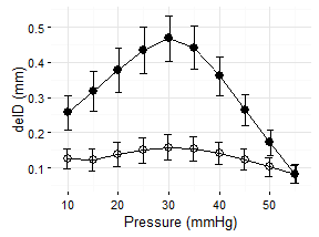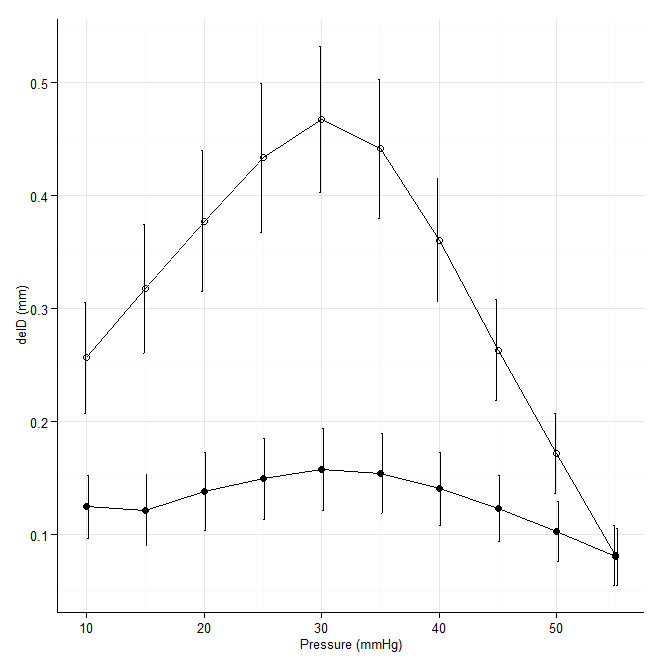 p <- p + xlab("Pressure (mmHg)") + ylab("delD (mm)")