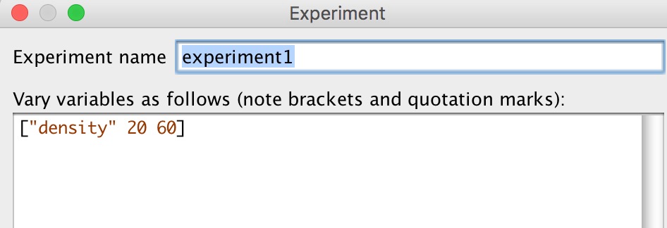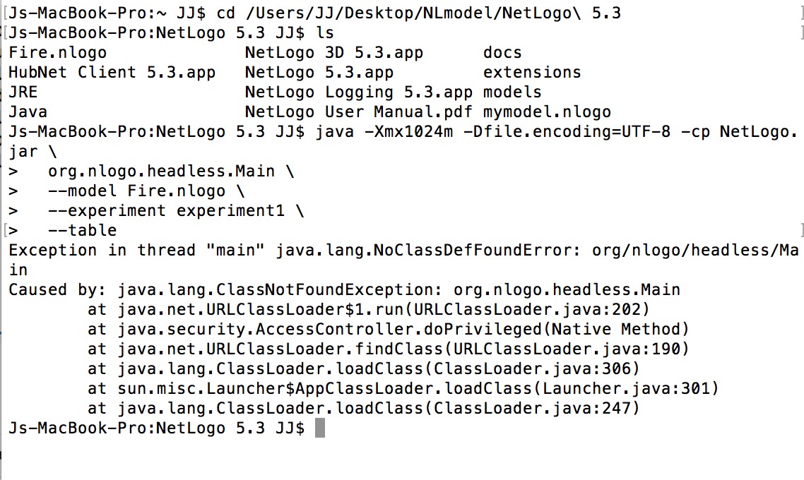 我觉得我必须为这样一个基本的问题道歉,但我只想在无头模式下运行BehaviorSpace实验就会出错。我尝试从命令行运行我自己的模型实验,但得到了一个错误。因此,我试着按照BehaviorSpace文档上的确切说明进行操作。为此,我在BehaviorSpace模型中创建了一个名为" experiment1“的experiment1实验(参见屏幕快照),然后尝试从命令行执行运行experiment1的命令。终端的屏幕截图显示,我首先设置安装了NetLogo 5.3的目录,然后尝试运行BehaviorSpace文档中的命令。终端的屏幕截图也显示了我正在获取的Java错误。我以前从未使用过终端,也不知道我做错了什么,但我确信我错过了一些简单的东西。
