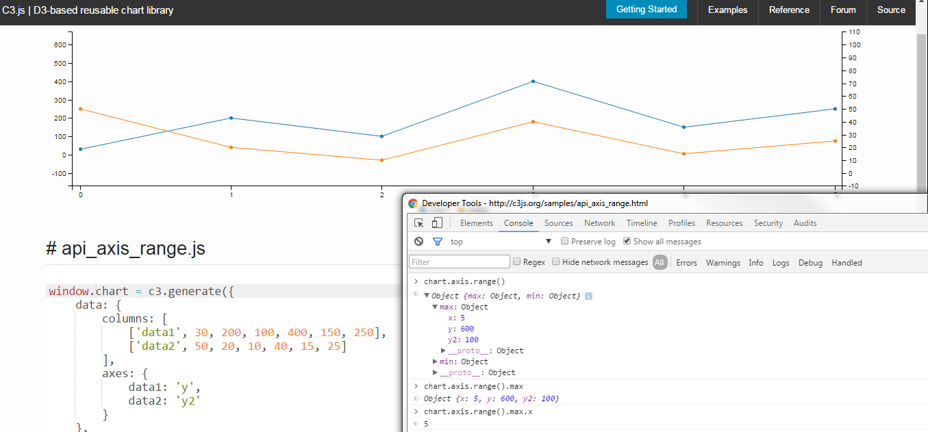 使用chart.axis.range()获取一个包含max{x,y,y2}和min{x,y,y2}的对象,如下所示,而不是chart.axis.max()。