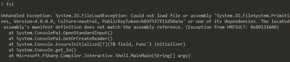 C:\Program Files (x86)\Microsoft SDKs\F#\4.0\Framework\v4.0\Fsi.exe出于某种原因,来自dotnet核心的fsi无法工作。我更改了系统路径中的顺序,以便F#工具出现在dotnet核心之前,从而解决了问题。