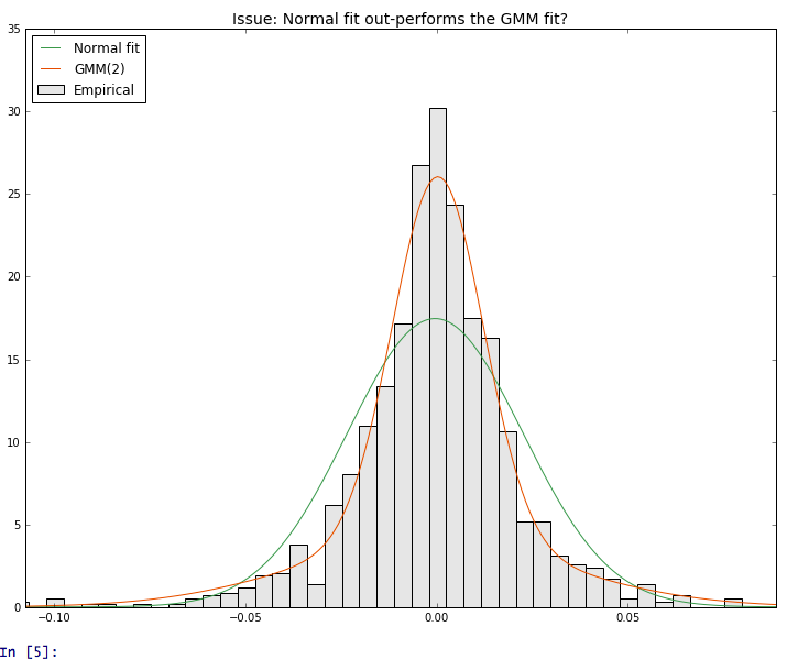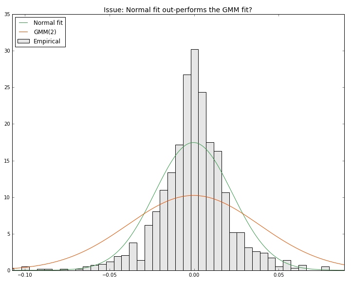 ax.set_title("Issue: Normal fit out-performs the GMM fit?", size = 14)