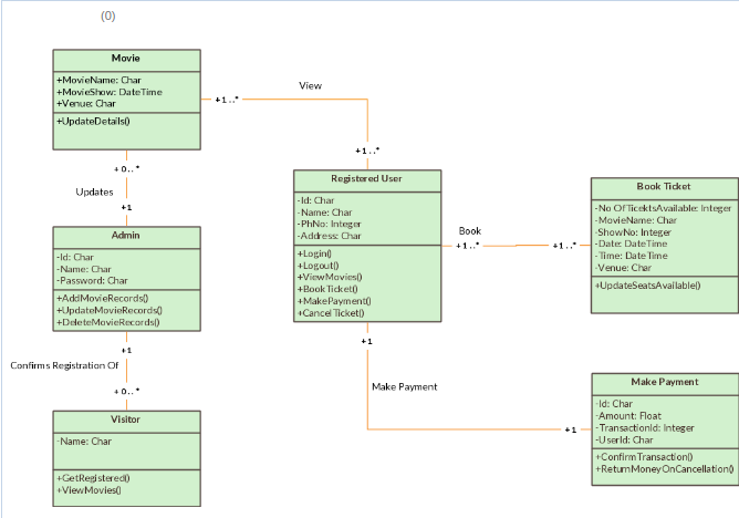 您的类图表明您还不熟悉类建模。类Book Ticket和Make Payment听起来像用例,而不是正确的类。类是处理这些数据的数据和功能的容器,而用例是参与者在系统帮助下执行的一项工作。