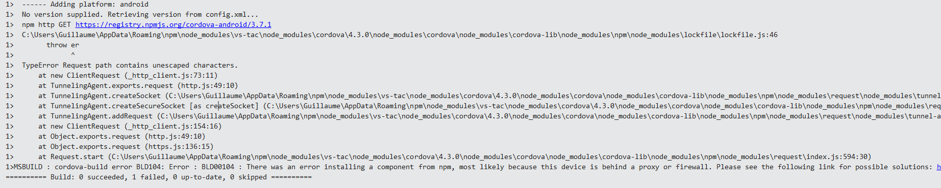 我今天升级到TACO 8.1,清除了Tools > Options中的Cordova缓存,克隆了我的git项目,现在我在为Android编译时得到了这个错误: