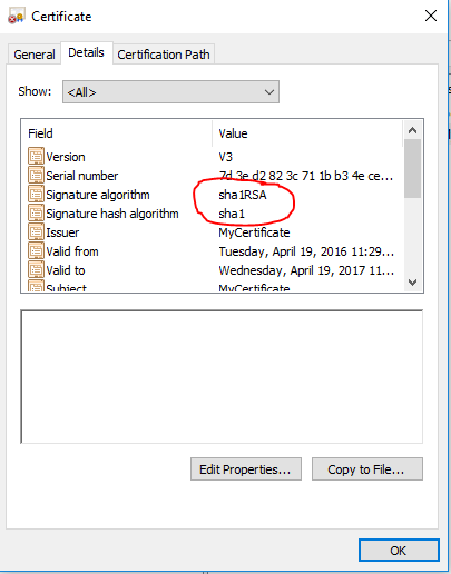 下面的PowerShell命令创建一个以SHA1作为签名算法的自签名证书.