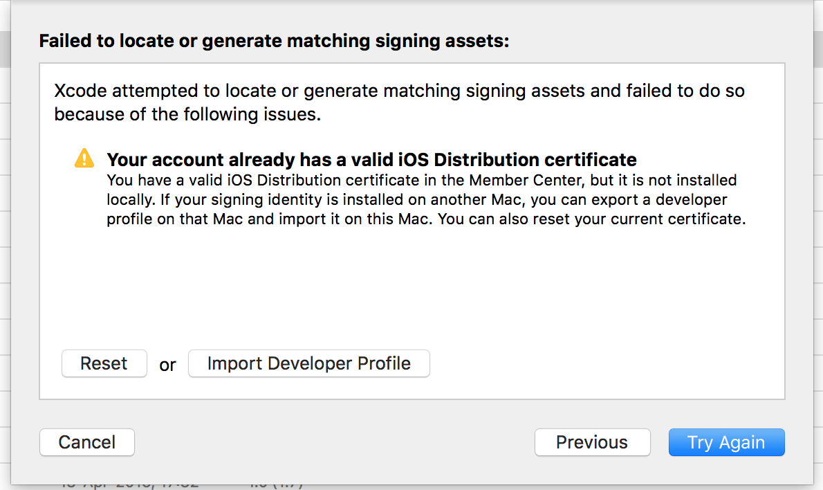 ,如果您仍然看到这个问题,,您可以采取这些附加步骤来清除可能导致问题的旧缓存。打开Macbook上的密钥链访问程序。查找没有与其关联的私钥的旧证书。没有私钥的证书(p12)的旁边不会有一个灰色的公开箭头。删除这些,然后重试。