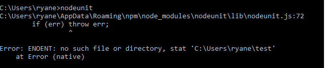 嗨,我试着安装Nodeunit,但是当我尝试运行nodeunit命令时,它只会给出一个错误。下面的截图是错误。如有任何帮助,将不胜感激。