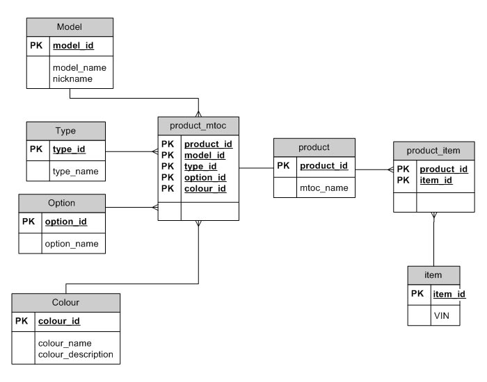 在汽车行业工作。它们有MTOC (型号、类型、选项和颜色)的概念。这四个项目结合在一起创建一个产品类型。然后,产品类型用于由VIN (车辆标识号)标识的产品的多个实例。