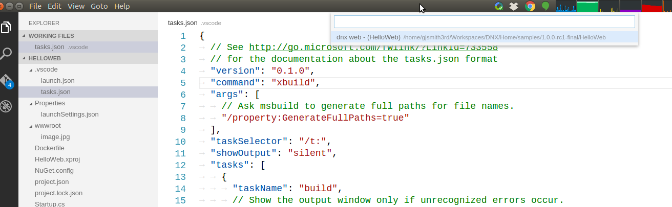 当我使用'ctrl+shift+p‘来获得命令托盘时,我可以得到dnx:Run Command,但是在选择这个命令之后,我就得不到dnx web - (MyApplication)了。当我试图使用dnx web从终端运行相同的应用程序时。我得到了正确的结果: