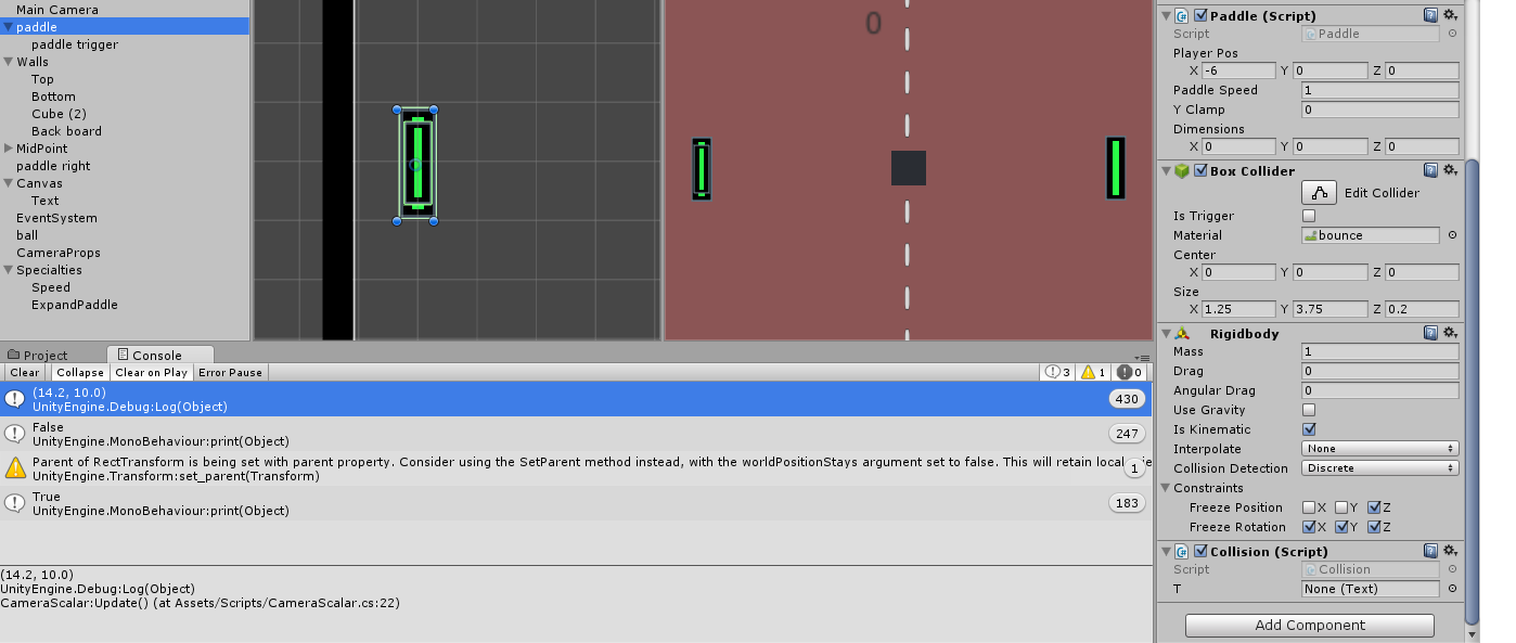 此外,我知道你很可能只是想让这个工作,但这可以用一个更好的方式。您根本不需要子对象。只需将BoxCollider2D组件附加到可见的桨上,并从那里检测冲突。