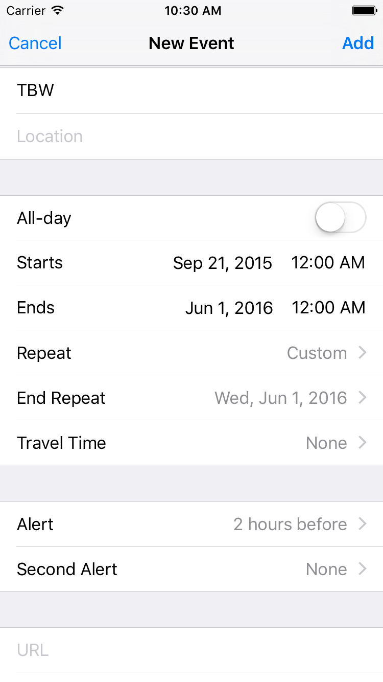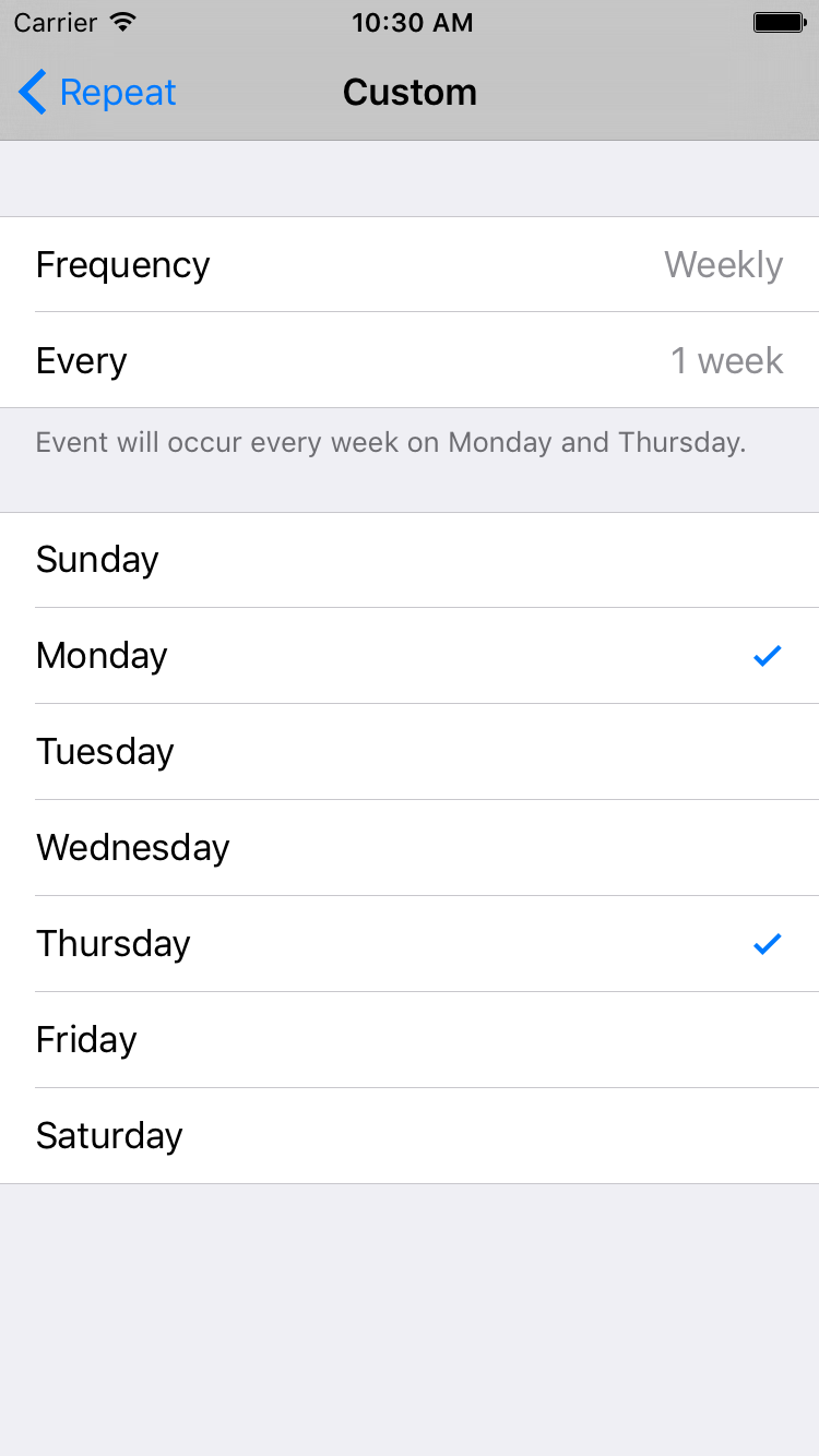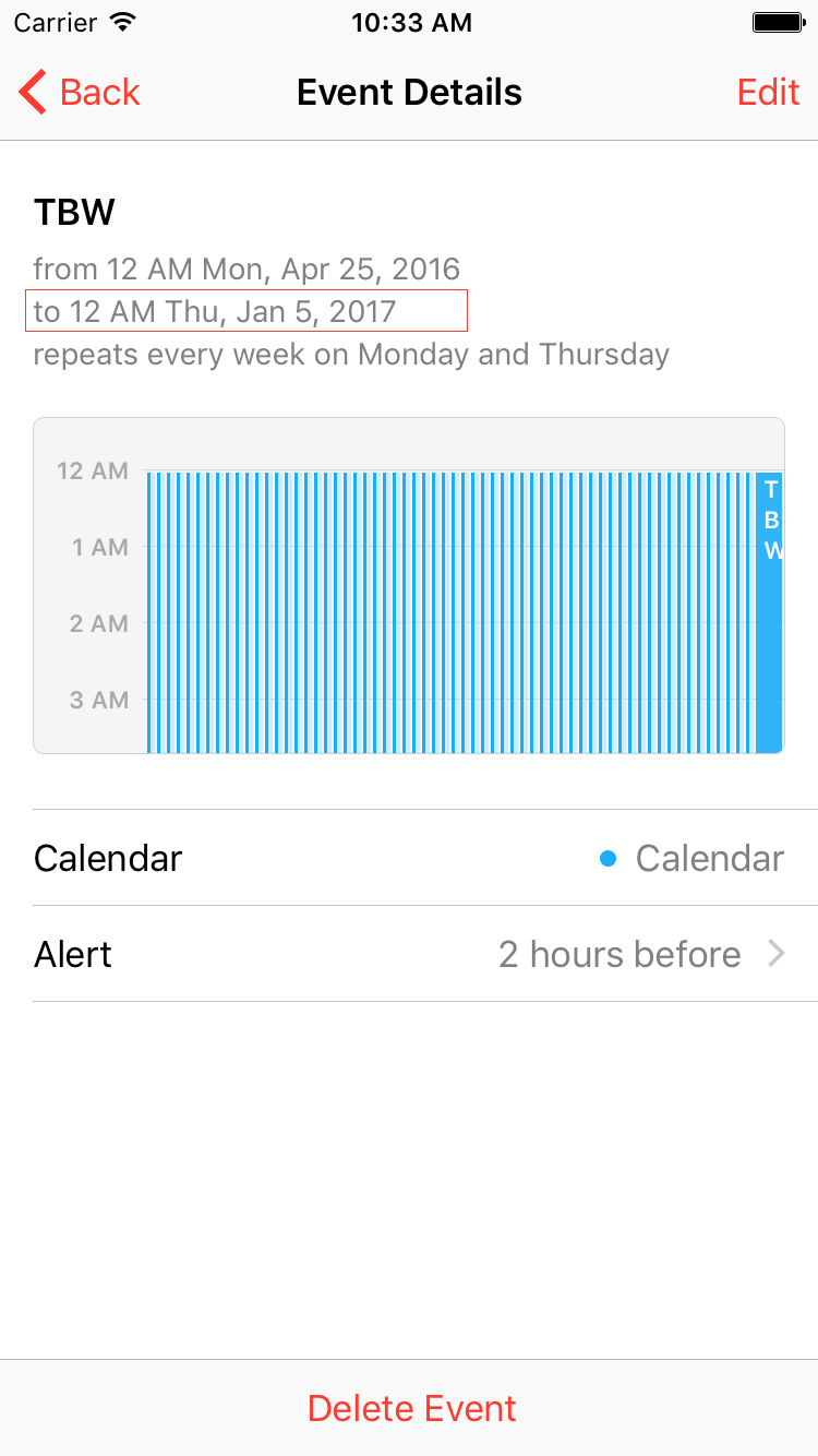 recurrence = EKRecurrenceRule <0x7f94b43e7110> RRULE FREQ=WEEKLY;INTERVAL=1;UNTIL=20160531T183000Z;BYDAY=MO,TH;